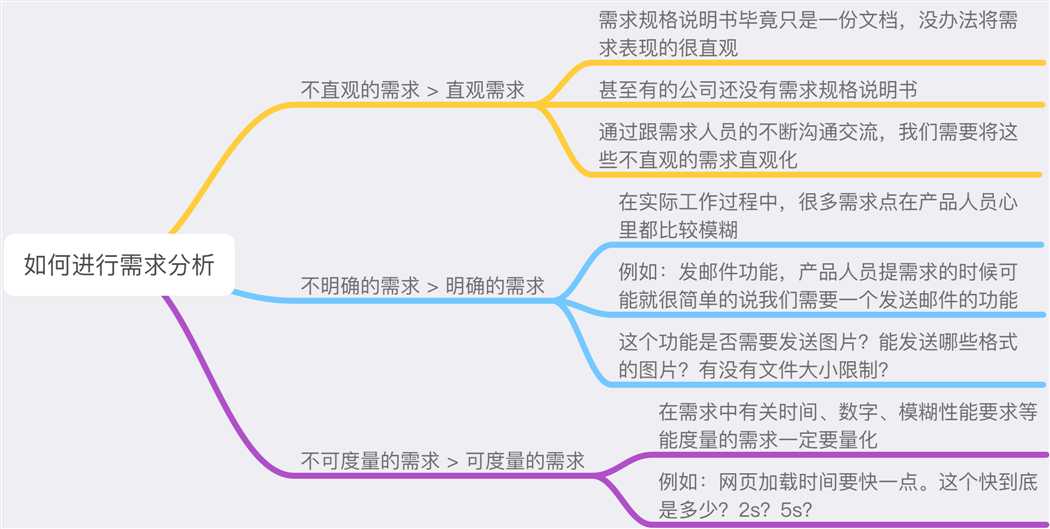 在需求分析阶段,测试人员既要详细的理解产品需要,又要从用户的角度出发,分析出需求中不完善的地方,还要协调开发与测试对于需求理解的一致性,保证需求信息在开发和测试双方中的统一。