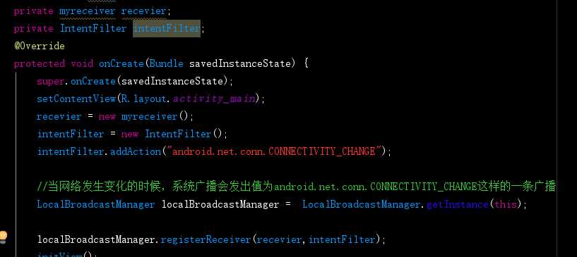 这里我们将广播类与intentFilter类声明为全局变量,便于之后的注册与注销