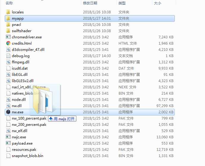 6.将应用打包成app.nw文件,进入myapp文件夹中,将所有文件选择打成zip包,然后改名为app.nw
