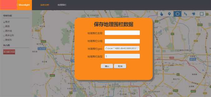 17 result += ‘ 半径:‘ + e.overlay.getRadius(); 18 result += ‘ 中心点:‘ + e.overlay.getCenter().lng + "," + e.overlay.getCenter().lat; 19 var circle_r = e.overlay.getRadius(); 20 var circle_lng = e.overlay.getCenter().lng; 21 var circle_lat = e.overlay.getCenter().lat; 22 var url_toPic = "url?point=" + circle_lat + "," + circle_lng + "&radius=" + circle_r; 23 24 /* 向后台发送post请求 地理围栏数据*/ 25 // 圈选之后会自动跳出一个弹窗,用于可以自行保存相应的数据,自行设置名称和分组,而地理围栏geo和类型则是根据用户全选情况而自动添加。