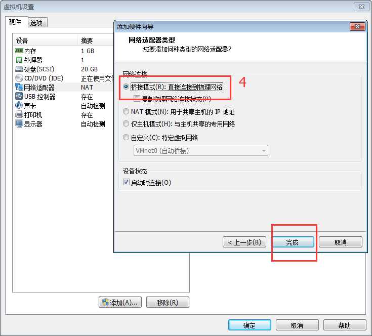第二步:添加一块网卡。模式为桥接,和物理机网段一样是192.168.1.0/24 网段。如图。