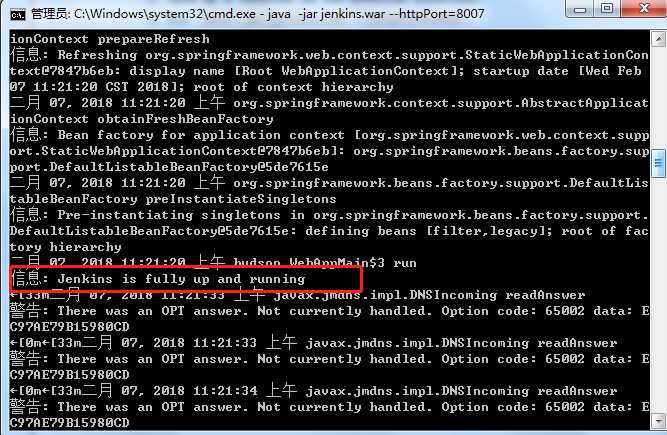 我的例子启动jenkins,cmd进入到jenkins的解压目录后使用命令 java -jar jenkins.war --httpPort=8007