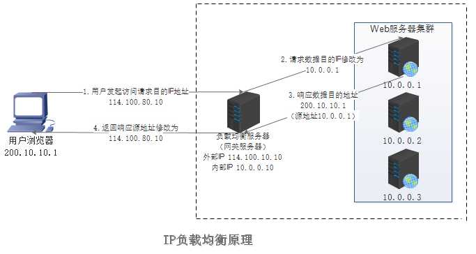 真实的Web服务器处理完后,响应数据包回到负载均衡服务器,负载均衡服务器再将数据包修改为自身的IP地址(114.100.80.10)发送给用户浏览器。