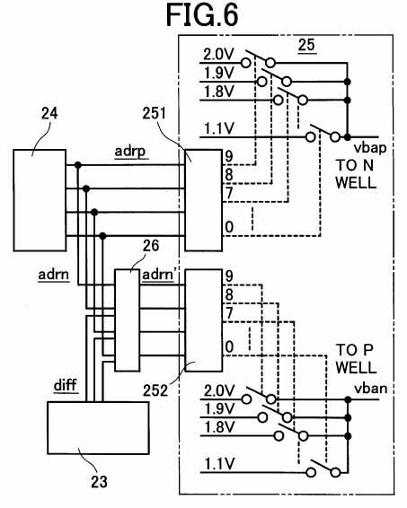 FIG. 6?shows a concrete example of the relations among the PN Vt balance compensation circuit?23, shift register?24, well bias generator?25, and adder?26?by using a concrete example of the well bias generator?25?in?FIG. 2?as a main component. In the diagram, it is assumed that the well bias generator?25?can generate well biases of 10 levels. The shift register?24?receives the signals "up" and "down" and generates a signal adrp of four bits. In the example, the signal adrn is the same as the signal adrp. To the signal adrn, the difference signal diff of the PN Vt balance compensation circuit?23?is added by the adder?26, thereby converting the signal adrn into a signal adrn′. The difference signal diff consists of three bits from the LSD side of the signal adrp. The well bias generator?25?is provided with decoders?251?and?252. According to the signals adrp and adrn′, a signal is output to any of output terminals 0 to 9. Further, as shown in the diagram, the well bias generator?25?has wires connected to the voltages sources of 1.1V to 2.0V in increments of 0.1V. As schematically shown by switches, according to a signal appearing at any of the output terminals 0 to 9 of the decoders?251?and?252, one of the voltages is selected and supplied as an N-well bias vbap and a P-well bias vban to each well terminal. For example, when a signal appears at the output terminal 8 of the decoder?251, the N-well bias vbap is set as 1.9V. When a signal appears at the output terminal 7 of the decoder?252, the P-well bias vban is set as 1.8V.