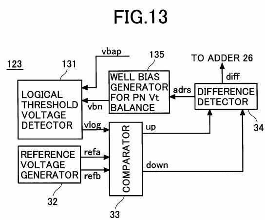 FIG. 12?is a block diagram showing a second embodiment of the control circuit?11?illustrated in FIG.?1. In the embodiment, the control circuit?11?is constructed by the delay monitor?21, comparator?22, PN Vt balance compensation circuit?123, shift register?24, well bias generator?25, and adder26.