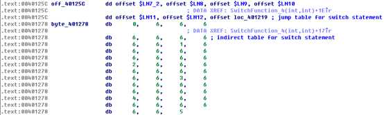 编译器为了节省空间,使用了双重跳转:跳转表、间接跳转表。其中跳转表与之前介绍的跳转表一致,而间接跳转表保存的不是分支地址,而是索引值,指向跳转表中的索引。