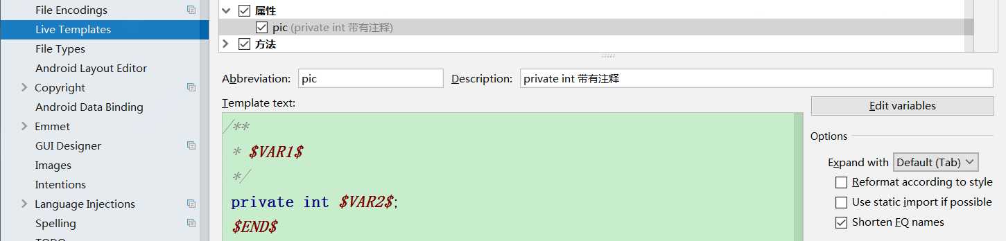 如定义:private static final int DEFAULT_AGE=18; 可配置成live template