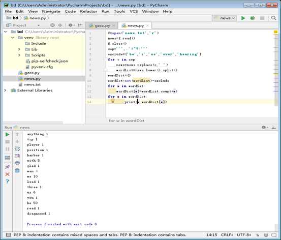 f=open(‘news.txt‘,‘r‘) news=f.read() f.close() sep=‘‘‘,.‘!"?:‘‘‘ exclude={‘be‘,‘i‘,‘so‘,‘over‘,‘hearing‘} for c in sep: news=news.replace(c,‘ ‘) wordList=news.lower().split() wordDict={} wordSet=set(wordList)-exclude for w in wordSet: wordDict[w]=wordList.count(w) for w in wordDict: print(w,wordDict[w])
