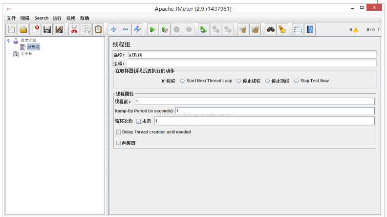 首先解压apache-jmeter-2.9,进入bin目录:点击jmeter.bat。启动软件,开始界面: