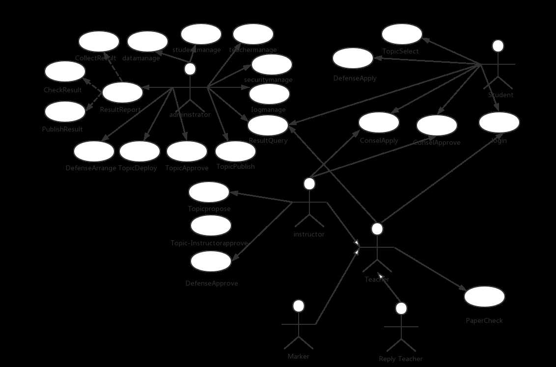 项目前期毕业论文管理的相关业务用例及其流程图,得到毕业论文管理系统的用例图。