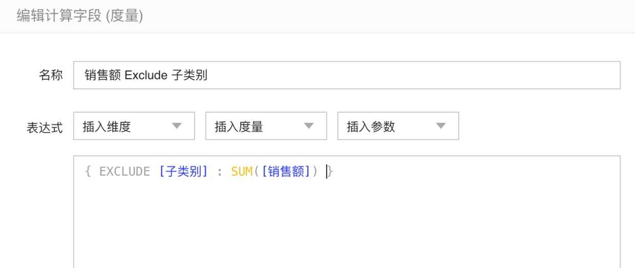 我们可以使用EXCLUED表达式细来完成此要求。我们排除“子类别”维度。我们新建一个计算字段,名为 “销售额 Exclude 子类别”: