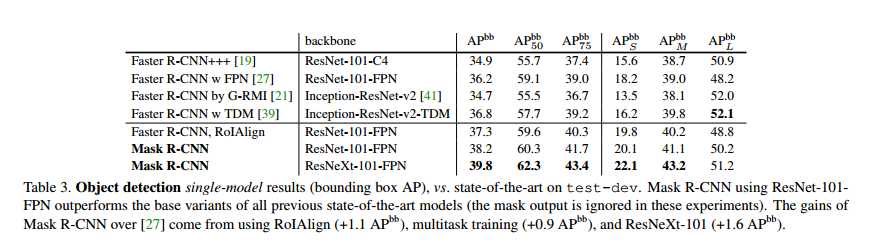 论文中还和RoIWarp(J. Dai, K. He, and J. Sun. Instance-aware semantic segmentation via multi-task network cascades. In CVPR, 2016. 2, 3,4, 5, 6 )进行了比较,实验结果表明RoIAlign的效果要好于 RoIWarp。