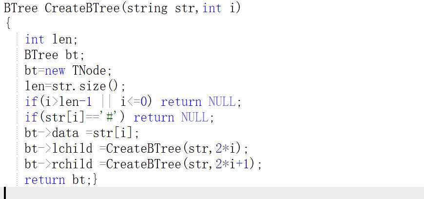 所以利用这个关系将顺序二叉树转为链式二叉树,bt->lchild =CreateBTree(str,2*i), bt->rchild =CreateBTree(str,2*i+1)。