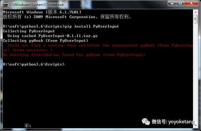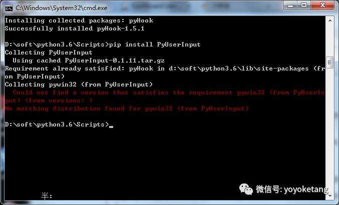 2.报错:No matching distribution found for pyHook (from PyUserInput)