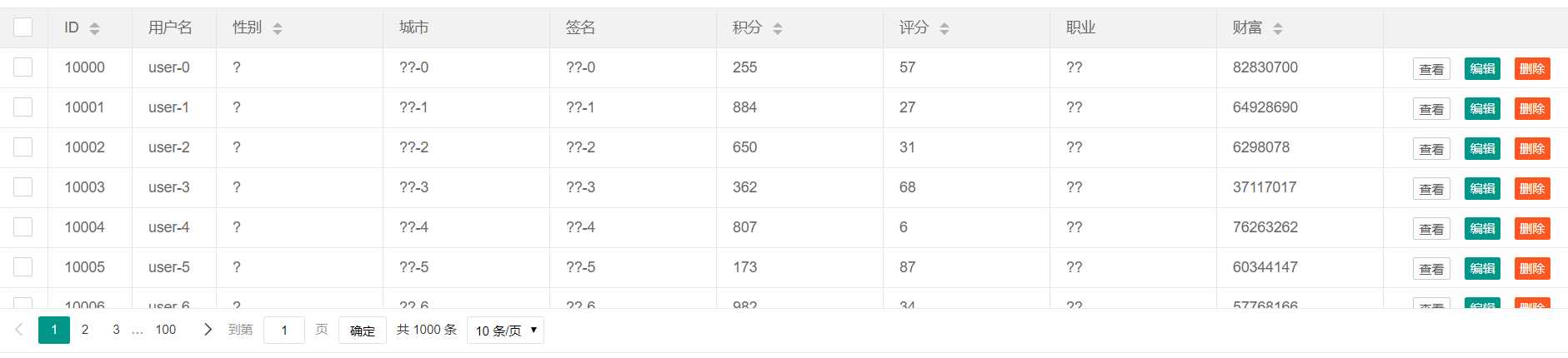 1 <!DOCTYPE html> 2 <html> 3 <head> 4 <meta charset="utf-8"> 5 <meta name="viewport" content="width=device-width, initial-scale=1, maximum-scale=1"> 6 <title>layout 后台大布局 - Layui</title> 7 <link rel="stylesheet" href="layui/css/layui.css"> 8 <script type="text/javascript" src="layui/layui.js"></script> 9 </head> 10 <body> 11 <table class="layui-hide" id="LAY_table_user" lay-filter="useruv"></table> 12 <script type="text/html" id="barDemo"> 13 <a class="layui-btn layui-btn-primary layui-btn-xs" lay-event="detail">查看</a> 14 <a class="layui-btn layui-btn-xs" lay-event="edit">编辑</a> 15 <a class="layui-btn layui-btn-danger layui-btn-xs" lay-event="del">删除</a> 16 </script> 17 <script> 18 layui.use([‘laydate‘, ‘laypage‘, ‘layer‘, ‘table‘, ‘carousel‘, ‘upload‘, ‘element‘], function(){ 19 var laydate = layui.laydate //日期 20 ,laypage = layui.laypage //分页 21 layer = layui.layer //弹层 22 ,table = layui.table //表格 23 ,carousel = layui.carousel //轮播 24 ,upload = layui.upload //上传 25 ,element = layui.element; //元素操作 26 27 table.render({ 28 elem: ‘#LAY_table_user‘ 29 ,url:‘http://localhost:8080/Limit/UVServlet‘ 30 ,height: 332 31 ,page: true //开启分页 32 ,cols: [[ 33 {type:‘checkbox‘} 34 ,{field:‘id‘, width:80, title: ‘ID‘, sort: true} 35 ,{field:‘username‘, width:80, title: ‘用户名‘} 36 ,{field:‘sex‘, title: ‘性别‘, sort: true} 37 ,{field:‘city‘, title: ‘城市‘} 38 ,{field:‘sign‘, title: ‘签名‘, minWidth: 100} 39 ,{field:‘experience‘, title: ‘积分‘, sort: true} 40 ,{field:‘score‘, title: ‘评分‘, sort: true} 41 ,{field:‘classify‘, title: ‘职业‘} 42 ,{field:‘wealth‘, title: ‘财富‘, sort: true} 43 ,{fixed: ‘right‘, width: 200, align:‘center‘, toolbar: ‘#barDemo‘} 44 ]] 45 }); 46 47 }); 48 </script> 49 <script type="text/javascript" src="layui/jquery1.8.3.min.js"></script> 50 </body> 51 </html>