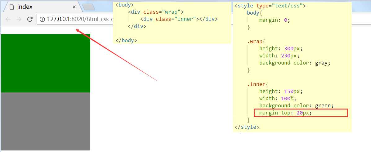 需求:把inner(绿色的div往下移动20px),我们会想到使用margin-top: 20px