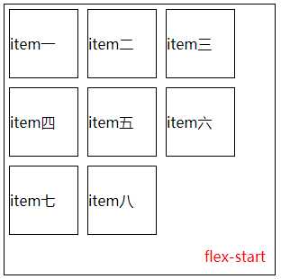 <!DOCTYPE html> <html lang="en"> <head> <meta charset="UTF-8"> <title>flex布局</title> <style type="text/css"> .box{ display:flex; /*flex-direction: column;*/ flex-wrap:wrap; /*flex-flow: column wrap;*/ /*justify-content: center;*/ /*align-items:stretch;*/ align-content:space-around; border:1px solid black; height:300px; width:300px; position:relative; } .item{ border:1px solid black; margin:5px; width:25%; height:25%; display:flex; align-items: center; } .box span{ position: absolute; right: 10px; bottom:10px; color: red; } /*.item1{ height:15%; } .item2{ height:25%; } .item3{ height:35%; }*/ </style> </head> <body> <div class="box"> <div class="item item1">item一</div> <div class="item item2">item二</div> <div class="item item3">item三</div> <div class="item">item四</div> <div class="item">item五</div> <div class="item">item六</div> <div class="item">item七</div> <div class="item">item八</div> <span>space-around</span> </div> </body> </html>