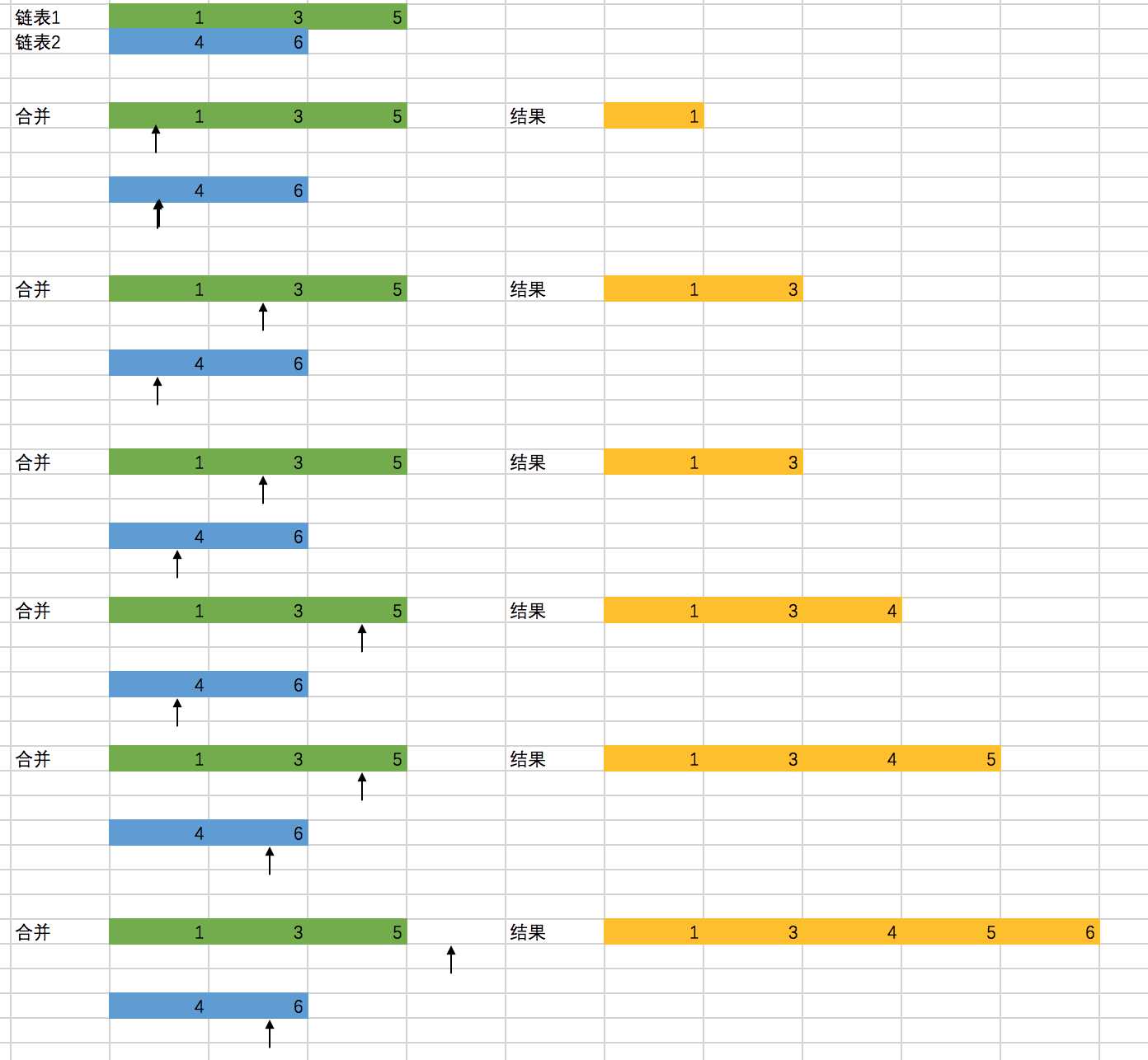 每次都是比较箭头节点,把小节点连接到已经合并的链表之后,重复的执行此过程,最后如果那个链表已经走完,那就将另一个链表直接连接到合并的链表之后。