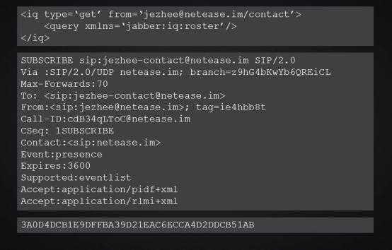 这是基于SIP的SIMPLE协议的一个请求样例,可以看到是一段类似HTTP协议的文本数据。这些协议的优势在于开源,有成熟的解决方案可以使用,扩展性好,甚至还可以和其他系统互联互通,协议的可读性也非常好。但是在普遍比较臃肿,冗余字段很多,在昂贵的移动网络里面用起来会比较浪费。网易云信采用的是私有的二进制协议,这是一个请求的数据样例,这里是把二进制数据转为了16进制显示出来,每个字节这里显示为两个字符。可以看到二进制协议的特点在于完全失去了可读性,但是,却带来极高的表达效率,相对于文本协议,可以节省非常多的数据流量。