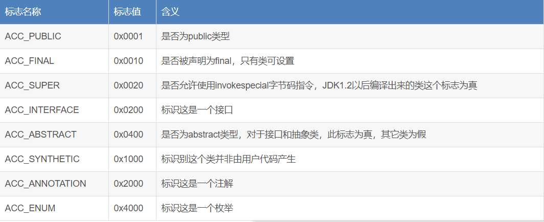常量池结束之后,紧着有俩字节代表的是访问标志,用于识别一些类或者接口层次的访问信息。包括,该class是类还是接口,是否为public,是否定义了abstract,如果是类的话,是否有final属性。
