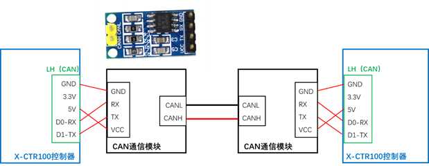 使用CAN接口模块TJA1050进行CAN通信操作,实现了数据循环发送和数据接收显示功能,可通过2块X-CTR100控制器通信,或者使用1块X-CTR100和CAN分析仪通信,本例程以2套X-CTR100通信为例进行说明。