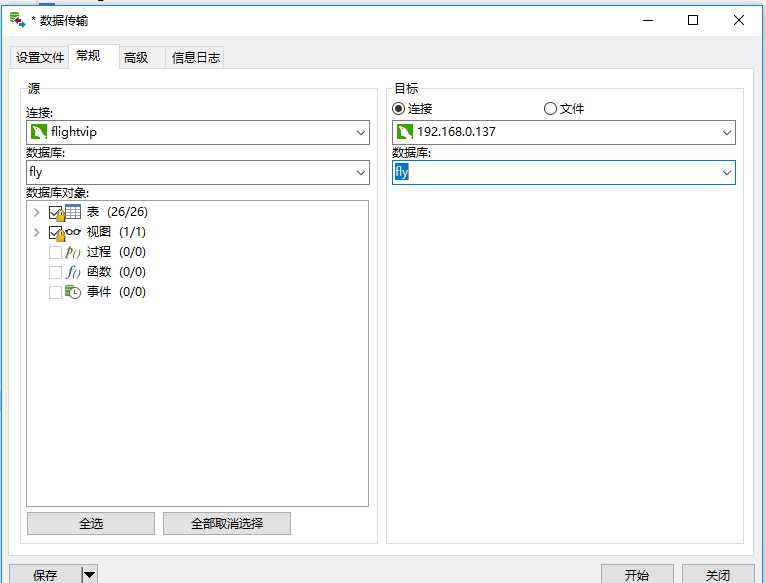 2、出现如下对话框,分别选择源链接和目标连接中的数据库,然后点击开始进行数据同步传输。