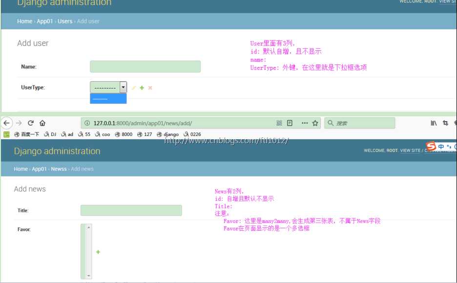 favor = models.ManyToManyField("User") # DjangoAdmin里面显示2个字段[title + favor多选框]