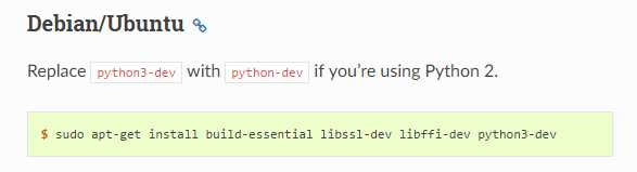 sudo apt-get install build-essential libssl-dev libffi-dev python-dev