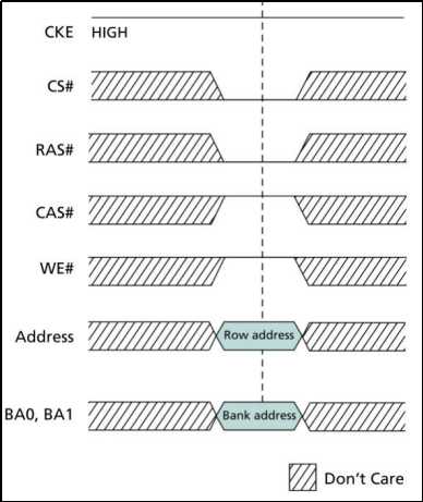 进行存储单元寻址时,需要先选中要访问的Bank和行,使它处于激活状态。该操作通过“行有效”(ACTIVE)命令实现,见图 26-5,发送行有效命令时,RAS线为低电平,同时通过BA线以及A线发送Bank地址和行地址。