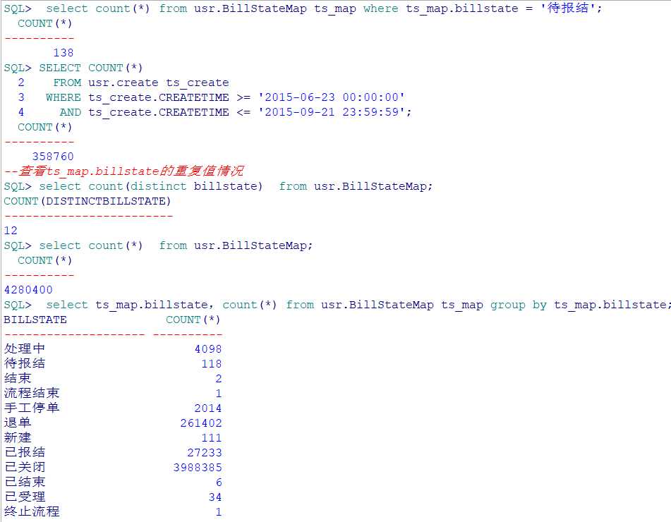 SELECT /* ^^*/ COUNT(DISTINCT ts_map.draftid) AS recordCount FROM usr.BillStateMap ts_map INNER JOIN usr.create ts_create ON ts_create.draftid = ts_map.draftid LEFT JOIN usr.search ts_search ON ts_create.draftid = ts_search.draftid LEFT JOIN usr.accept accept ON ts_create.draftid = accept.draftid LEFT JOIN usr.kfvistirecord ts_kfback ON ts_kfback.draftid = ts_create.draftid LEFT JOIN (SELECT DISTINCT .. .. .. . FROM usr.create_user t_user) ts_user ON ts_create.draftid = ts_user.creatinfoid WHERE 1 = 1 AND (ts_create.location = ‘0579‘ OR ts_user.location = ‘0579‘) AND ts_create.CREATETIME >= ‘2015-06-23 00:00:00‘ AND ts_create.CREATETIME <= ‘2015-09-21 23:59:59‘ AND ts_map.billstate = ‘待报结‘ ORDER BY ts_create.draftId DESC;
