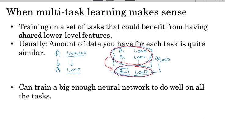 实际上,也可以分别构建多个神经网络来实现。但是,如果各个任务之间是相似问题(例如都是图片类别检测),则可以使用多任务学习模型。