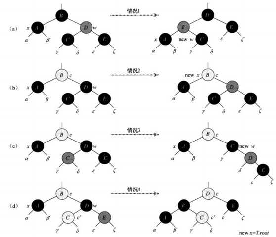 同样有删除和删除之后维持红黑树性质的修复操作,这里涉及到图中展示的4种不同情况的操作