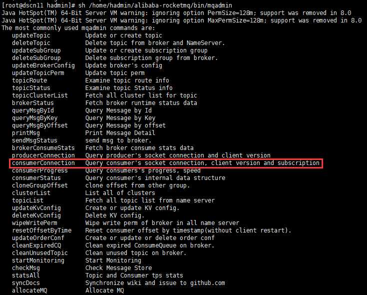 命令:sh /home/hadmin/alibaba-rocketmq/bin/mqadmin consumerConnection -n "10.11.2.4:9876;10.11.2.5:9876" -g face2