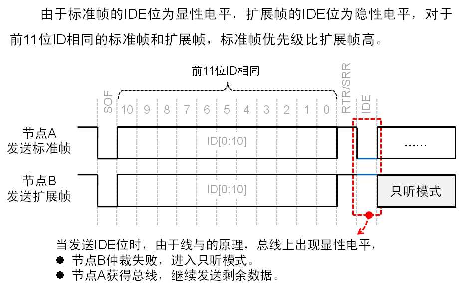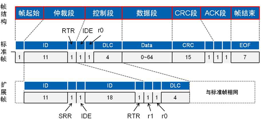 结构上由7个段组成,其中根据仲裁段ID码长度的不同,分为标准帧(CAN2.0A)和扩展帧(CAN2.0B)。