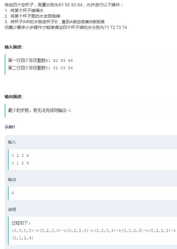 // Study.cpp: 定义控制台应用程序的入口点。 // #include "stdafx.h" #include<iostream> #include<cstdio> #include<cstring> #include<algorithm> #include<bitset> using namespace std; /*将4杯子倒水问题改为一个足够大的杯子倒向4个杯子*/ bitset<17043521> Hash;/*(大小为64*64^4+64*64^3+64*64^2+64*64^1+64*64^0)记录每次操作后的ABCD杯子的当前容量是否已经存在过*/ const int MAX_STEP = 100000; int WQ[MAX_STEP][6];/*记录每步操作后0和ABCD的当前容量,最后一个记录操作次数*/ int Goal[5];/*0和ABCD杯子最终状态*/ int Cap[5]; /*0和ABCD杯子的最大容量*/ int goalval; int head = 0; int tail = 0; void movw(int numfrom, int numto, int other1, int other2, int other3)/*numfrom倒入numto*/ { int total = WQ[head][numfrom] + WQ[head][numto];/*numfrom和numto的总量*/ WQ[tail][other1] = WQ[head][other1]; WQ[tail][other2] = WQ[head][other2]; WQ[tail][other3] = WQ[head][other3]; WQ[tail][5] = WQ[head][5] + 1; if (total>Cap[numto])/*总量和被倒入杯子的容量大小;大于numfrom就有剩余的,否则全部倒入numto*/ { WQ[tail][numfrom] = total - Cap[numto]; WQ[tail][numto] = Cap[numto]; } else { WQ[tail][numfrom] = 0; WQ[tail][numto] = total; } int hashval = WQ[tail][1] * 262144 + WQ[tail][2] * 4096 + WQ[tail][3] * 64 + WQ[tail][4];/*把ABCD杯子需要的状态抽象为一个值*/ if (hashval == goalval) throw WQ[head][5] + 1;/*判断是否为最终状态*/ if (!Hash[hashval])/*该次操作之后的状态之前未存在过并记录*/ { Hash[hashval] = true; if (++tail == MAX_STEP) tail = 0;/*超出最大操作数*/ } } int main() { Hash.reset(); scanf_s("%d %d %d %d", &Cap[1], &Cap[2], &Cap[3], &Cap[4]); scanf_s("%d %d %d %d", &Goal[1], &Goal[2], &Goal[3], &Goal[4]); head = 0; tail = 0; goalval = Goal[1] * 262144 + Goal[2] * 4096 + Goal[3] * 64 + Goal[4];/*把ABCD杯子需要的状态抽象为一个值*/ /*处理全部杯子中最后容量都为0的情况*/ if (Goal[1] == 0 && Goal[2] == 0 && Goal[3] == 0 && Goal[4] == 0) { printf("0"); return 0; } Cap[0] = 6400;/*0杯子为足够大的杯子,0杯子的容量*/ WQ[tail][0] = 6400;/*0杯子的当前容量*/ /*初始化ABCD杯子当前值为0*/ WQ[tail][1] = 0; WQ[tail][2] = 0; WQ[tail][3] = 0; WQ[tail][4] = 0; WQ[tail][5] = 0; ++tail; try { /*尝试每一种操作*/ while (head != tail) { /*A导入B,外层if判断A中当前容量不为零,内层判断B的最大容量不为0*/ if (WQ[head][0]) { if (Cap[1]) movw(0, 1, 2, 3, 4); if (Cap[2]) movw(0, 2, 1, 3, 4); if (Cap[3]) movw(0, 3, 1, 2, 4); if (Cap[4]) movw(0, 4, 1, 2, 3); } if (WQ[head][1]) { if (Cap[0]) movw(1, 0, 2, 3, 4); if (Cap[2]) movw(1, 2, 0, 3, 4); if (Cap[3]) movw(1, 3, 0, 2, 4); if (Cap[4]) movw(1, 4, 0, 2, 3); } if (WQ[head][2]) { if (Cap[0]) movw(2, 0, 1, 3, 4); if (Cap[1]) movw(2, 1, 0, 3, 4); if (Cap[3]) movw(2, 3, 0, 1, 4); if (Cap[4]) movw(2, 4, 0, 1, 3); } if (WQ[head][3]) { if (Cap[0]) movw(3, 0, 1, 2, 4); if (Cap[1]) movw(3, 1, 0, 2, 4); if (Cap[2]) movw(3, 2, 0, 1, 4); if (Cap[4]) movw(3, 4, 0, 1, 2); } if (WQ[head][4]) { if (Cap[0]) movw(4, 0, 1, 2, 3); if (Cap[1]) movw(4, 1, 0, 2, 3); if (Cap[2]) movw(4, 2, 0, 1, 3); if (Cap[3]) movw(4, 3, 0, 1, 2); } if (++head == MAX_STEP) { head = 0; } } printf("-1"); } catch (int step) { printf("%d\n", step); } }