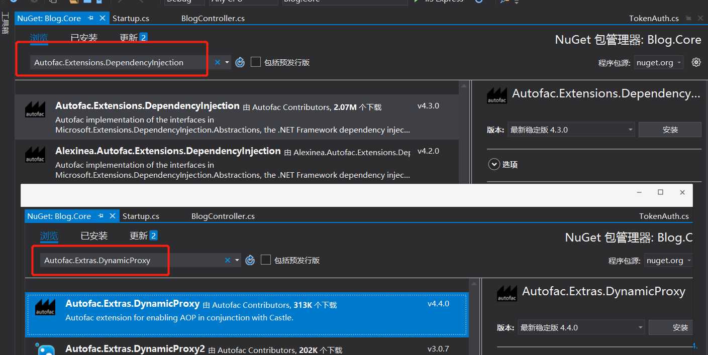 1、在Nuget中引入两个:Autofac.Extras.DynamicProxy(Autofac的动态代理,它依赖Autofac,所以可以不用单独引入Autofac)、Autofac.Extensions.DependencyInjection(Autofac的扩展)