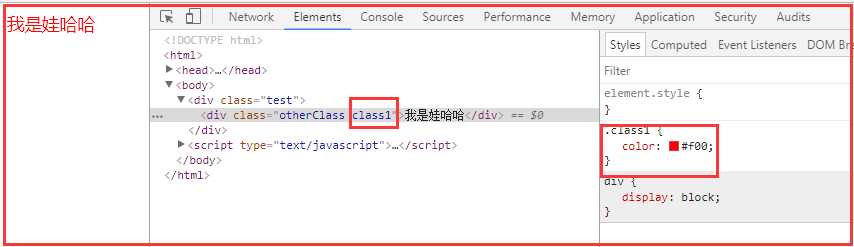 1 <!DOCTYPE html> 2 <html> 3 <head> 4 <meta charset="UTF-8"> 5 <title>class与style绑定</title> 6 <meta name="viewport" content="width=device-width,initial-scale=1,minimum-scale=1,maximum-scale=1,user-scalable=no" /> 7 <script src="../../node_modules/vue/dist/vue.js" type="text/javascript" charset="utf-8"></script> 8 <style> 9 .class1{ 10 color: #f00; 11 } 12 .class2{ 13 background-color: #00f; 14 } 15 </style> 16 </head> 17 <body> 18 <div class="test"> 19 <div class="otherClass" :class="{‘class1‘:name1,‘class2‘:name2}">我是娃哈哈</div> <!--方法一:用对象的方式实现 name1和name2是boolean型,为true时给元素加上对应的class,为false不添加--> 20 </div> 21 <script type="text/javascript"> 22 var myVue = new Vue({ 23 el:".test", 24 data: { 25 name1: true, 26 name2: false, 27 } 28 }) 29 </script> 30 </body> 31 </html>