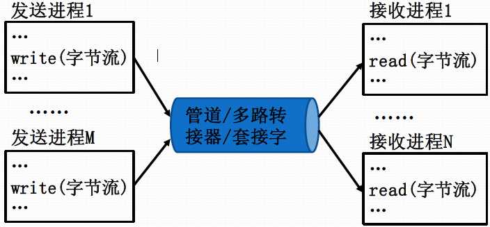 多个进程使用一个共享的消息缓冲区(可称为管道、多路转接器、套接字)。一些进程往消息缓冲区中写入字符流(send/write);一些进程从消息缓冲区中读出字符流(receive/read)。信息交换单位基于长度任意的字符流。