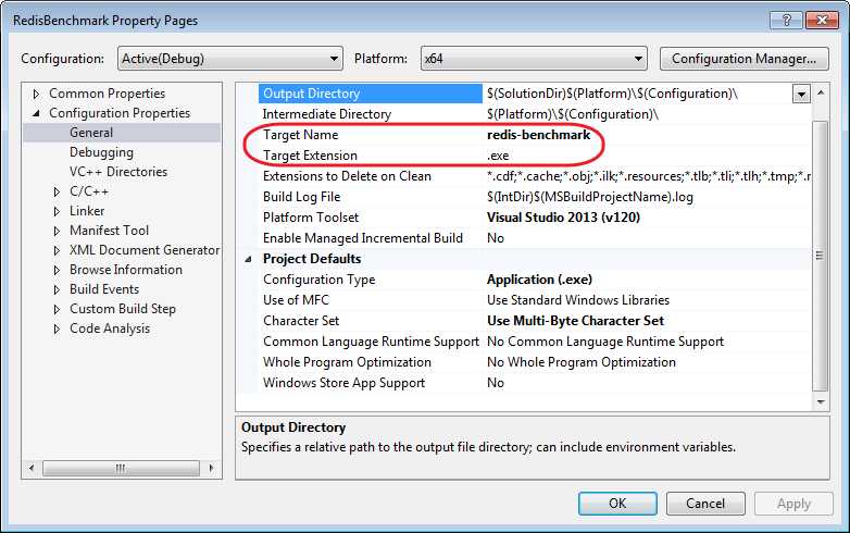 由于笔者的机器为64位,在编译之前我们确认一下编译 Platform, 同时我们可以看到对于此 project 将会编译产生 redis-server.exe 文件