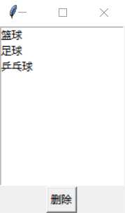 1 from tkinter import * 2 3 root = Tk() 4 # 创建一个空列表 5 theLB = Listbox(root, setgrid=True) 6 theLB.pack() 7 # 往列表里添加数据 8 for item in ["篮球", "足球", "乒乓球", "羽毛球"]: 9 theLB.insert(END, item) 10 theButton = Button(root, text="删除", command=lambda x=theLB: x.delete(ACTIVE)) 11 theButton.pack() 12 13 mainloop()