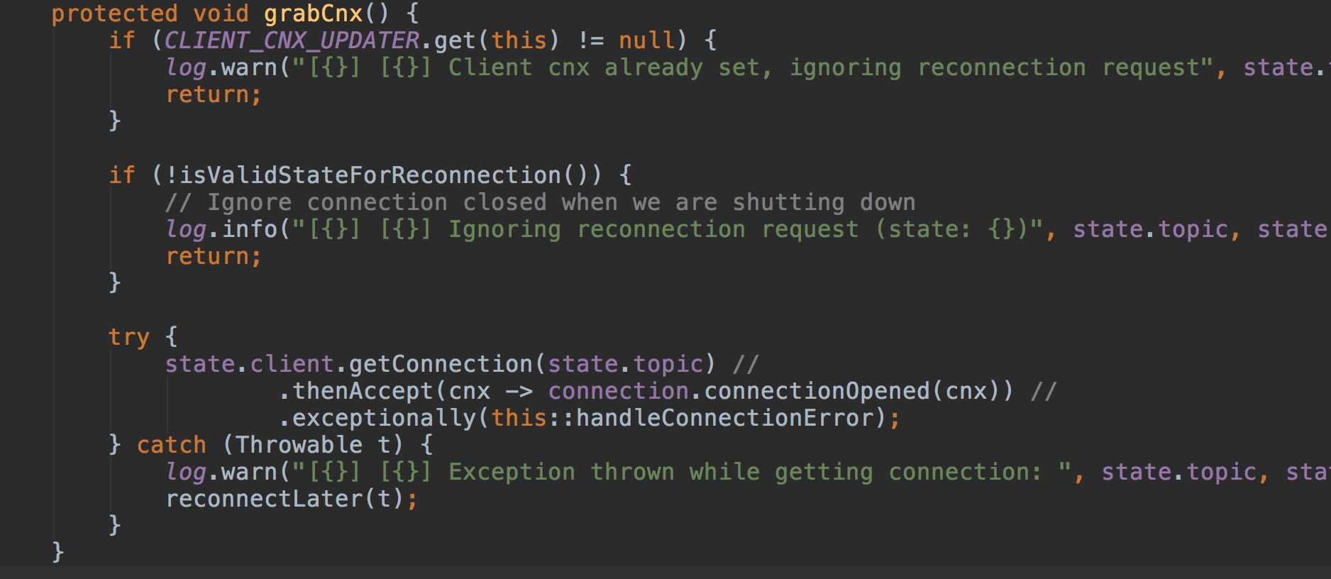 grabCnx方法通过PulsarClient创建Connection,而PubsarClient内部则通过LookupService接口来完成Topic到Broker的映射并建立链接。