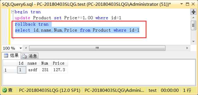 先执行事务:执行红框中的部分,表示这个事务只执行了一个查询,查询结果如下