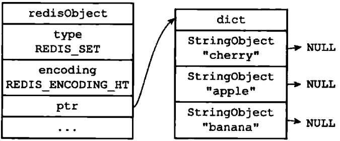 另一方面,hashtable编码的集合对象使用字典作为底层实现,字典的每个键都是一个字符串对象,每个字符串对象包含了一个集合元素,而字典的值则全部被设置为NULL,以下的示例,将创建一个如图1-13所示的hashtable编码集合对象: