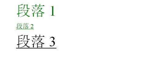 <style type="text/css"> .pp1{ font-size: 60px; color: green; } .pp2{ color:green; text-decoration: underline; } .pp3{ font-size: 60px; text-decoration: underline; } </style> <p class="pp1">段落1</p> <p class="pp2">段落2</p> <p class="pp3">段落3</p>