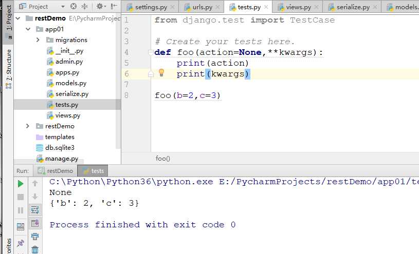 def foo(action=None,**kwargs): print(action) print(kwargs) foo(**{"d":5}) print("______________") foo({"d":5}) #总结:**字典等同于关键字传参 None {‘d‘: 5} ______________ {‘d‘: 5} {}