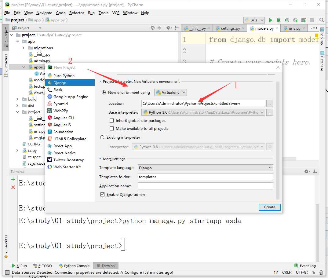 左上角创建dijango项目 , 1.路径 2.虚拟环境 (反正我是直装,管他三七二十一,emmm....)