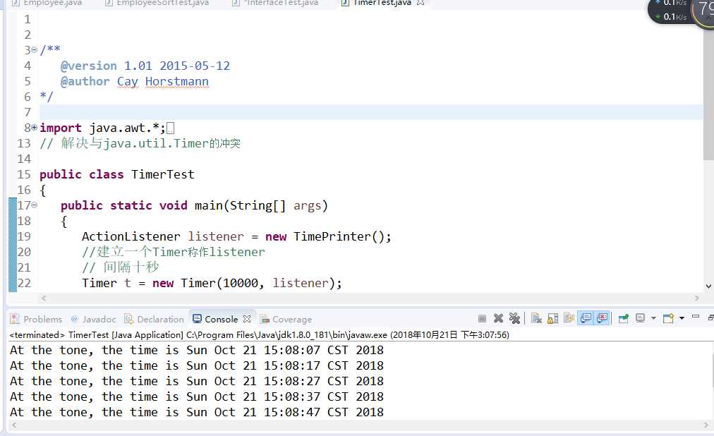 /** @version 1.01 2015-05-12 @author Cay Horstmann */ import java.awt.*; import java.awt.event.*; import java.util.*; import javax.swing.*; import javax.swing.Timer; // 解决与java.util.Timer的冲突 public class TimerTest { public static void main(String[] args) { ActionListener listener = new TimePrinter(); //建立一个Timer称作listener // 间隔十秒 Timer t = new Timer(10000, listener); t.start(); //按Quit program则程序停止 JOptionPane.showMessageDialog(null, "Quit program?"); System.exit(0); } } //内置接口 class TimePrinter implements ActionListener { public void actionPerformed(ActionEvent event) { System.out.println("At the tone, the time is " + new Date()); Toolkit.getDefaultToolkit().beep(); } }