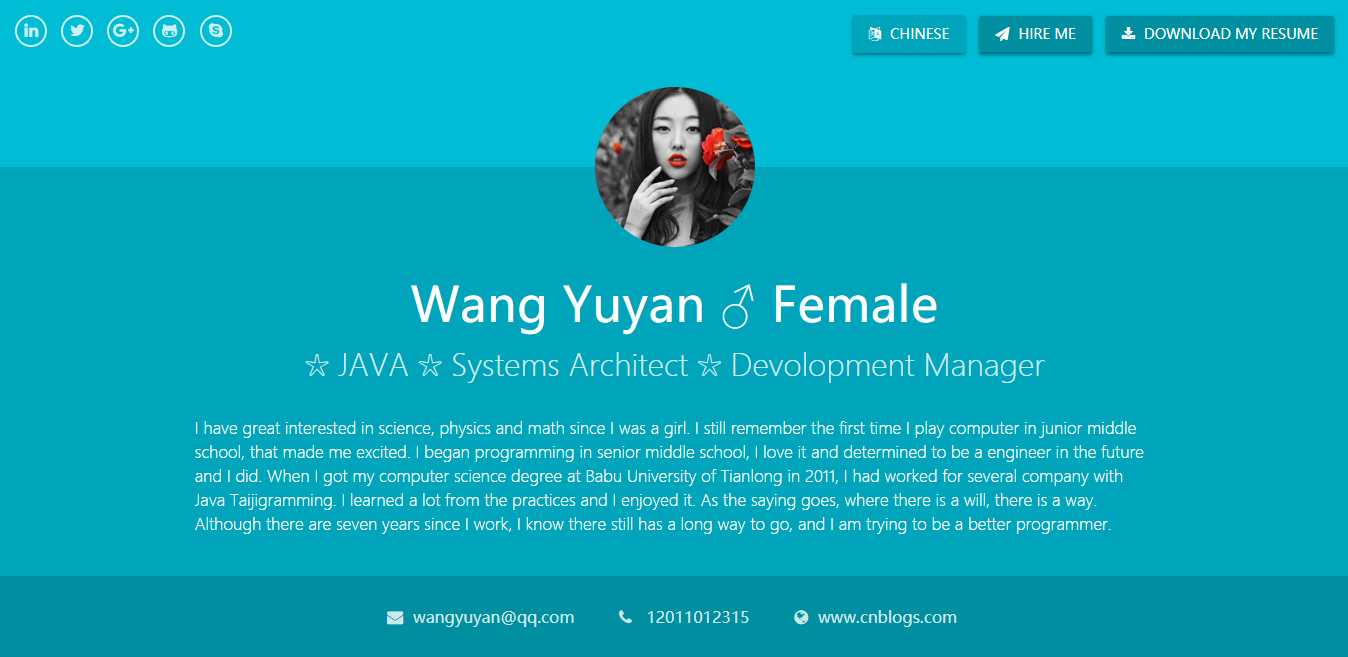 就这么简单,完成之后只需要修改JSON信息就可以定制自己的网上简历了。定制完成直接丢到tomcat就可以了,服务器连重启都不用。