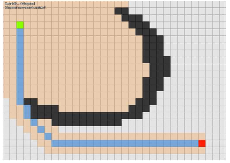 有几种解决方法可以使用,但是最简单(快速)的方法是一直跟着最近被添加到open列表中的方块。现在继续沿着最近被添加的方块前进。