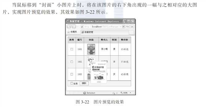 <!DOCTYPE html PUBLIC "-//W3C//DTD XHTML 1.0 Transitional//EN" "http://www.w3.org/ TR/xhtml1/DTD/xhtml1-transitional.dtd"> <html xmlns="http://www.w3.org/1999/xhtml"> <head> <meta charset="utf-8"> <title> 数据管理 </title> <script type="text/javascript" src="jquery-1.8.2.min.js"> </script> <style type="text/css"> body { font-size: 12px } table { width: 360px; border-collapse: collapse } table tr th, td { border: solid 1px #666; text-align: center } table tr td img { border: solid 1px #ccc; padding: 3px; width: 42px; height: 60px; cursor: hand } table tr td span { float: left; padding-left: 12px; } table tr th { background-color: #ccc; height: 32px } .clsImg { position: absolute; border: solid 1px #ccc; padding: 3px; width: 85px; height: 120px; background-color: #eee; display: none } .clsSpan { position: absolute; border: solid 1px #ccc; padding: 3px; width: 80px; background-color: rgba(93, 184, 146, 0.884); display: none } .btn { border: #666 1px solid; padding: 2px; width: 50px; filter: progid:DXImageTransform.Microsoft .Gradient(GradientType=0, StartColorStr=#ffffff, EndColorStr=#ECE9D8); } </style> <script type="text/javascript"> $(function () { $("table tr:nth-child(odd)") .css("background-color", "#eee"); // 隔行变色 /** 全选复选框单击事件 **/ $("#chkAll").click(function () { if (this.checked) {// 如果自己被选中 $("table tr td input[type=checkbox]") .attr("checked", true); } else {// 如果自己没有被选中 $("table tr td input[type=checkbox]") .attr("checked", false); } }) /** 删除按钮单击事件 **/ $("#btnDel").click(function () { var intL = $("table tr td input:checked:not(‘#chkAll‘)").length; // 获取除全选复选框外的所有选中项 if (intL != 0) {// 如果有选中项 $("table tr td input[type=checkbox]:not(‘#chkAll‘)") .each(function (index) {// 遍历除全选复选框外的行 if (this.checked) {// 如果选中 $("table tr[id=" + this.value + "]").remove(); // 获取选中的值,并删除该值所在的行 } }) } }) /** 小图片鼠标移动事件 **/ var x = 5; var y = 15;// 初始化提示图片位置 $("table tr td img").mousemove(function (e) { $("#imgTip") .attr("src", this.src)// 设置提示图片 scr 属性 .css({ "top": (e.pageY + y) + "px", "left": (e.pageX + x) + "px" })// 设置提示图片的位置 .show(30);// 显示图片 }) /** 小图片鼠标移出事件 **/ $("table tr td img").mouseout(function () { $("#imgTip").hide();// 隐藏图片 }) // 文本值 $("table tr td div").mousemove(function (e) { $("#spanTip") .text($(this).text()) .css({ "top": (e.pageY + y) + "px", "left": (e.pageX + x) + "px" })// 设置提示图片的位置 .show(30);// 显示图片 }) /** 文本鼠标移出事件 **/ $("table tr td div").mouseout(function () { $("#spanTip").hide();// 隐藏图片 }) }) </script> </head> <body> <table> <tr> <th> 选项 </th> <th> 编号 </th> <th> 封面 </th> <th> 购书人 </th> <th> 性别 </th> <th> 购书价 </th> <th>书名</th> </tr> <tr id="0"> <td><input id="Checkbox1" type="checkbox" value="0" /></td> <td>1001</td> <td><img src="Images/img03.jpg" alt="" /></td> <td> 李小明 </td> <td> 男 </td> <td>35.60 元 </td> <td><div>ASP.NET</div> </td> </tr> <tr id="1"> <td><input id="Checkbox2" type="checkbox" value="1" /></td> <td>1002</td> <td><img src="Images/img04.jpg" alt="" /></td> <td> 刘明明 </td> <td> 女 </td> <td>37.80 元 </td> <td><div>C#网站开发</div> </td> </tr> <tr id="2"> <td><input id="Checkbox3" type="checkbox" value="2" /></td> <td>1003</td> <td><img src="Images/img08.jpg" alt="" /></td> <td> 张小星 </td> <td> 女 </td> <td>45.60 元 </td> <td> <div>ASP</div> </td> </tr> </table> <table> <tr> <td style="text-align:left;height:28px"> <span><input id="chkAll" type="checkbox" /> 全选 </span> <span><input id="btnDel" type="button" value=" 删除 " class="btn" /></span> </td> </tr> </table> <img id="imgTip" class="clsImg" src="Images/img03.gif" /> <div id="spanTip" class="clsSpan" style="font-size:20px;"></div> </body> </html>